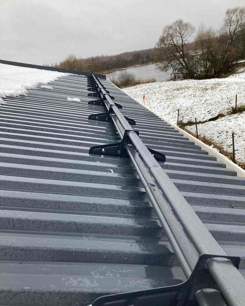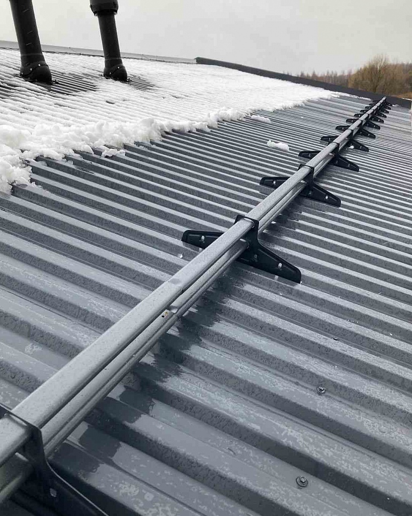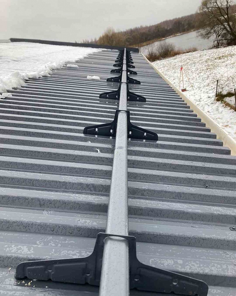 Устройство предназначено исключительно для фальцевой кровли. В наборе имеются комплект крепежей и плоских пластин, заворачивающихся в стоячий фальц без повреждения металла кровли.