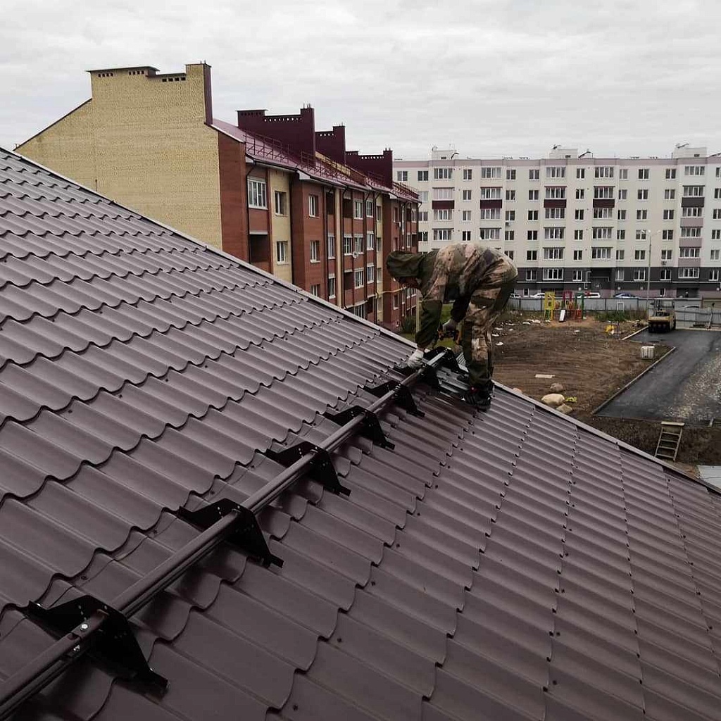 Общий принцип установки устройства сходный. Он производится путем крепления к кровельной конструкции (шаговой обрешетке) опорного кронштейна. Исключением является монтаж снегозадержателя к фальцевой кровле. В данном случае, во избежание нарушения герметичности кровли, опорный кронштейн прикрепляется к стоячему фальцу двумя пластинами.